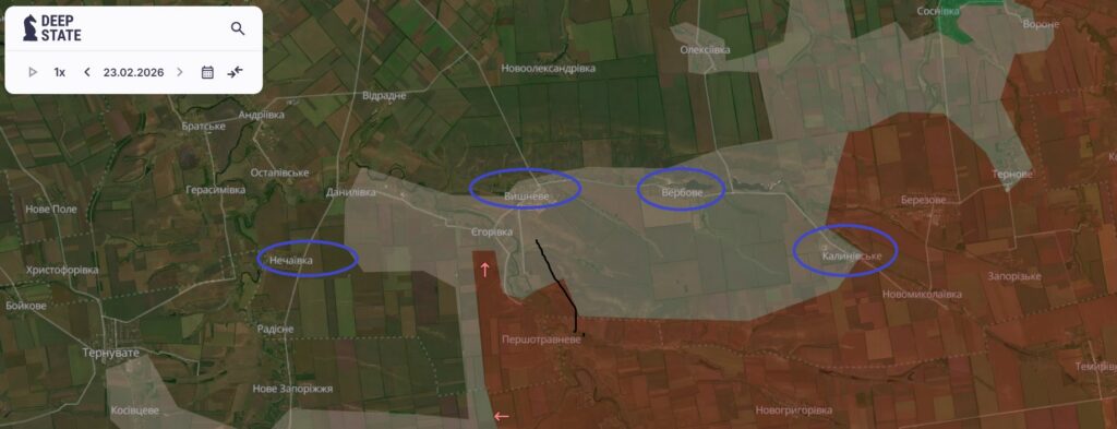 На цьому ж відтинку Вербове утримується за нами. Тривають бої за Степове та Калинівське, противник намагається втримати тактичні вузли, які дозволяють йому стримувати подальше просування, але інтенсивність зіткнень свідчить про поступову втрату ініціативи з їхнього боку.
