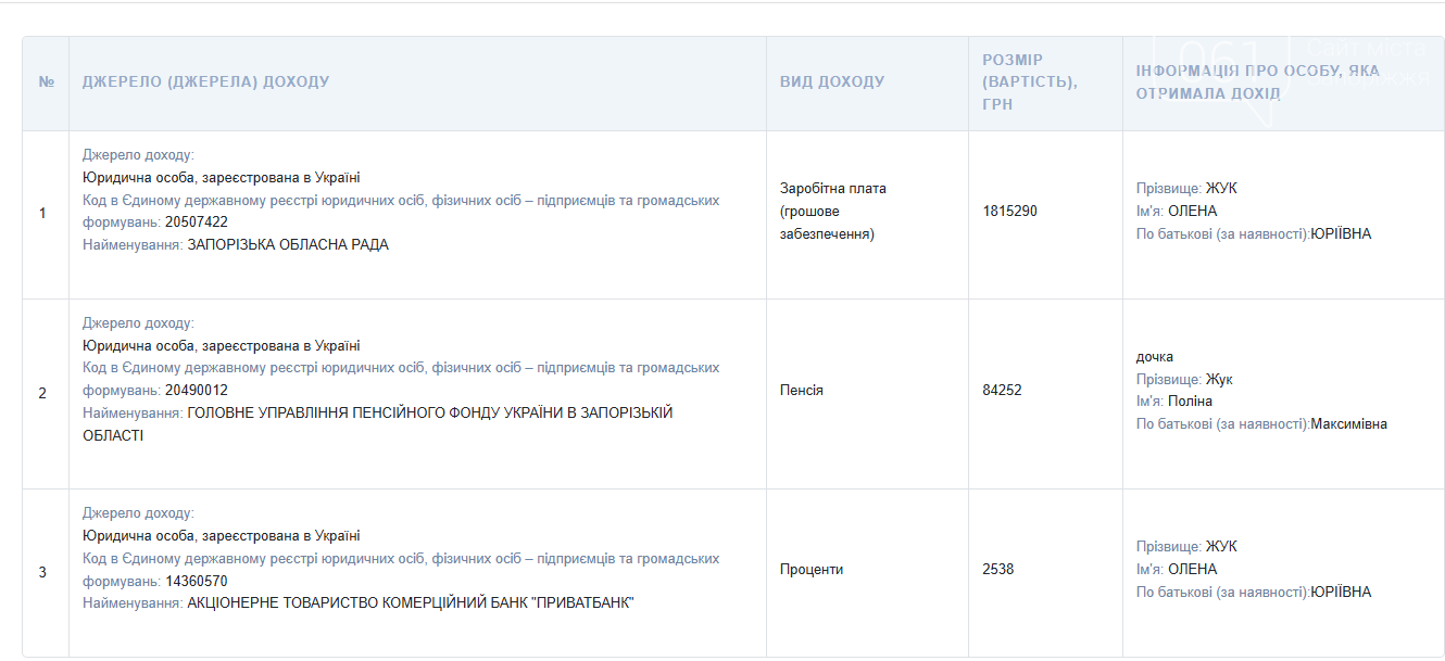 За рік вона отримала 1,8 мільйона гривень зарплати в Запорізькій обласній раді — це приблизно на 400 тисяч більше, ніж у попередньому році. Також задекларувала 2 538 гривень банківських відсотків.