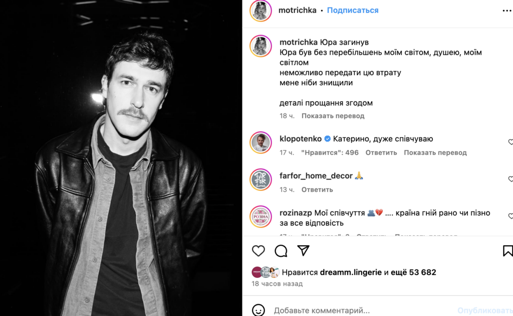 Повідомлення про його загибель з’явилося 15 червня. Цю новину підтвердила дружина Юрія, Катерина Мотрич. Вона залишила коротке, але наскрізь емоційне звернення у своєму Instagram: «Юра був моїм світом. Цю втрату не описати. Відчуття таке, ніби мене більше немає». За її словами, прощання з Юрієм відбудеться пізніше, і точну дату оголосять окремо.