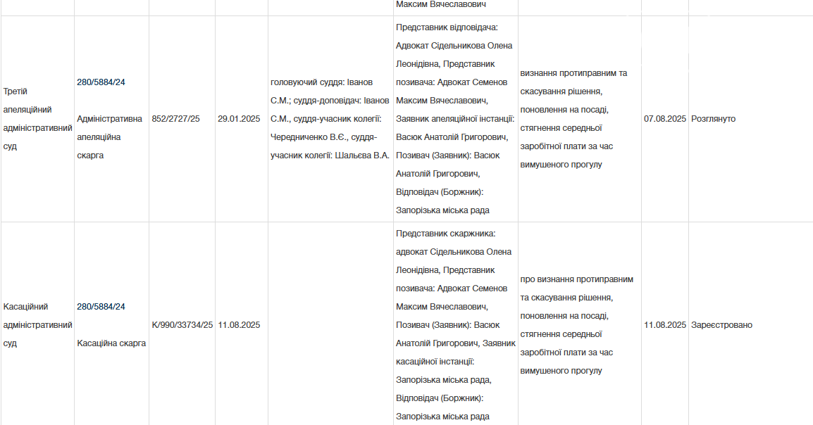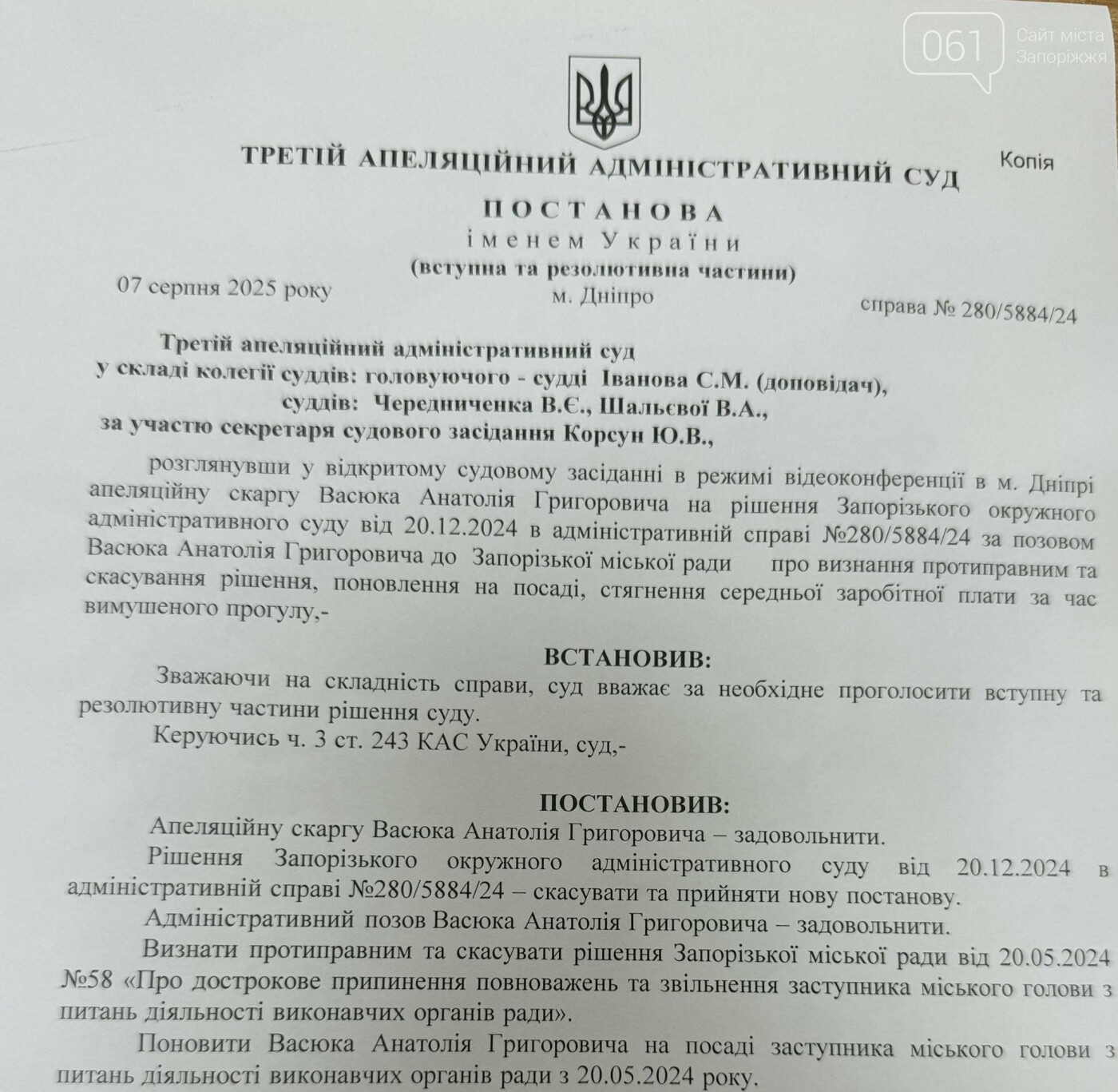 Третій апеляційний адміністративний суд у Дніпрі скасував рішення Запорізького окружного адміністративного суду від 20 грудня 2024 року та повністю задовольнив позов колишнього заступника міського голови з гуманітарних питань Анатолія Васюка.