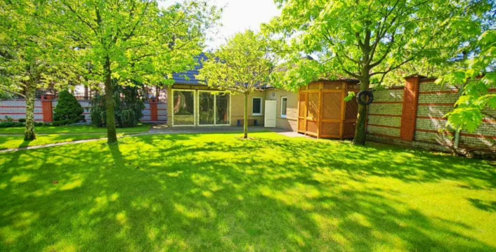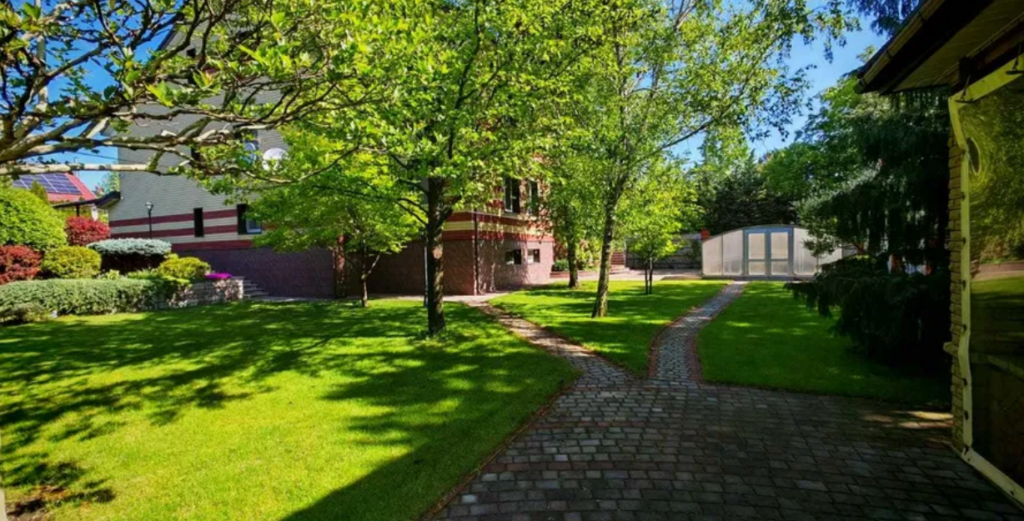 На території розташовані басейн із підігрівом, літня кухня з барбекю-зоною, гараж на дві машини, майстерня, водоспад із декоративним ставком, а також доглянуті сад і город. Всередині будинку облаштовано сауну з кімнатою відпочинку та ще одним басейном, спортивну залу, більярдну та серверну кімнату.