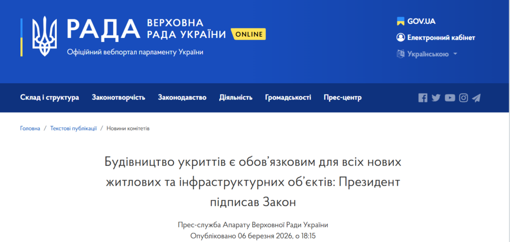 Президент України Володимир Зеленський підписав закон, який запроваджує обов’язкове будівництво захисних укриттів під час зведення нових житлових будинків і об’єктів інфраструктури. Документ покликаний посилити систему цивільного захисту з урахуванням досвіду повномасштабної війни.