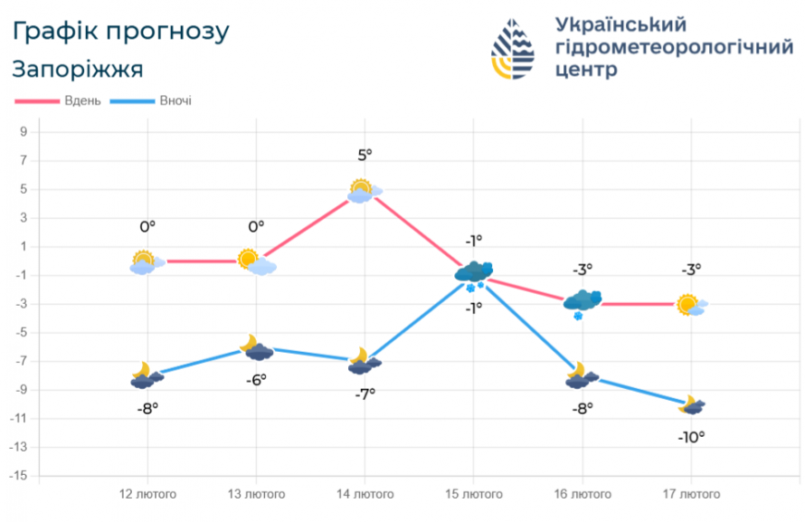 Так, завтра, 13 лютого, на запоріжців очікує мінлива хмарність. Опадів не прогнозується. Температура вночі очікується від -5 до -7 градусів, вдень – від -1 до +1 градуса вище нуля. Вітер буде переважно північно-східний із силою 3-8 метри на секунду.