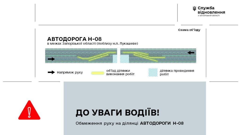 На одній із ключових доріг державного значення — трасі Н-08 Бориспіль – Дніпро – Запоріжжя – Маріуполь — тимчасово змінюється схема руху. Йдеться про ділянку поблизу села Лукашеве в Запорізькій області, де проводять технічне оновлення системи зважування у русі (WIM 15).