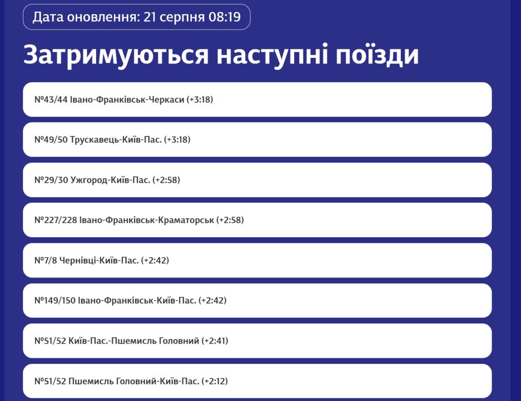 Вночі та зранку 21 серпня армія РФ здійснила комбіновану атаку по Україні. Унаслідок цього рух потягів ускладнено, повідомляє “Укрзалізниця”.