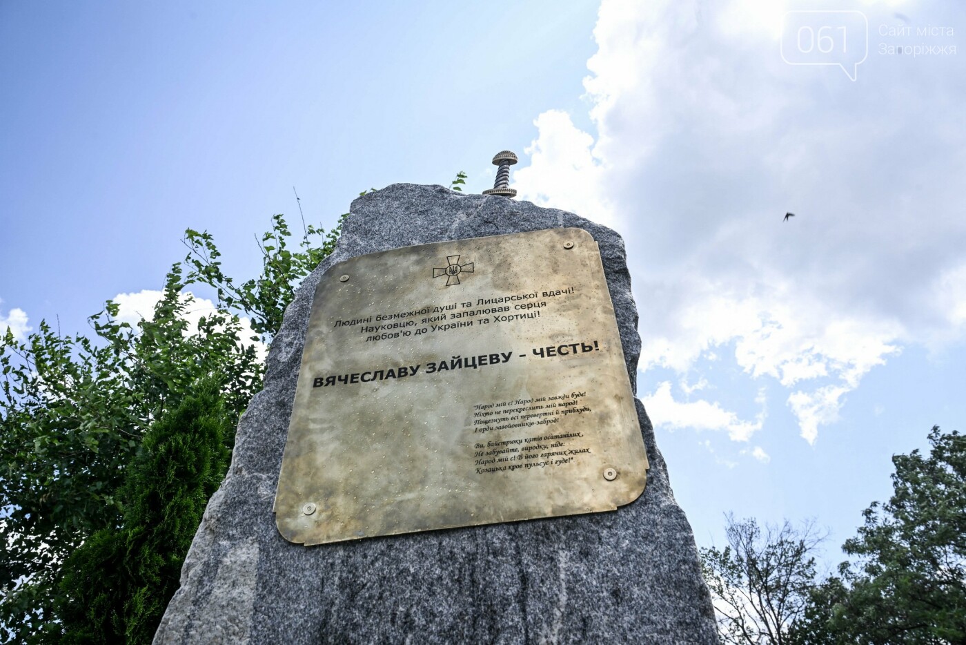 В червні на острові Хортиця у Запоріжжі, біля історико-культурного комплексу «Запорозька Січ» було відкрито пам’ятний знак на честь загиблого «кіборга», історика та захисника В’ячеслава Зайцева (позивний «Хортиця»). Меморіал у формі меча в камені встановлено на місці, яке він щиро любив, яким надихався та жив.