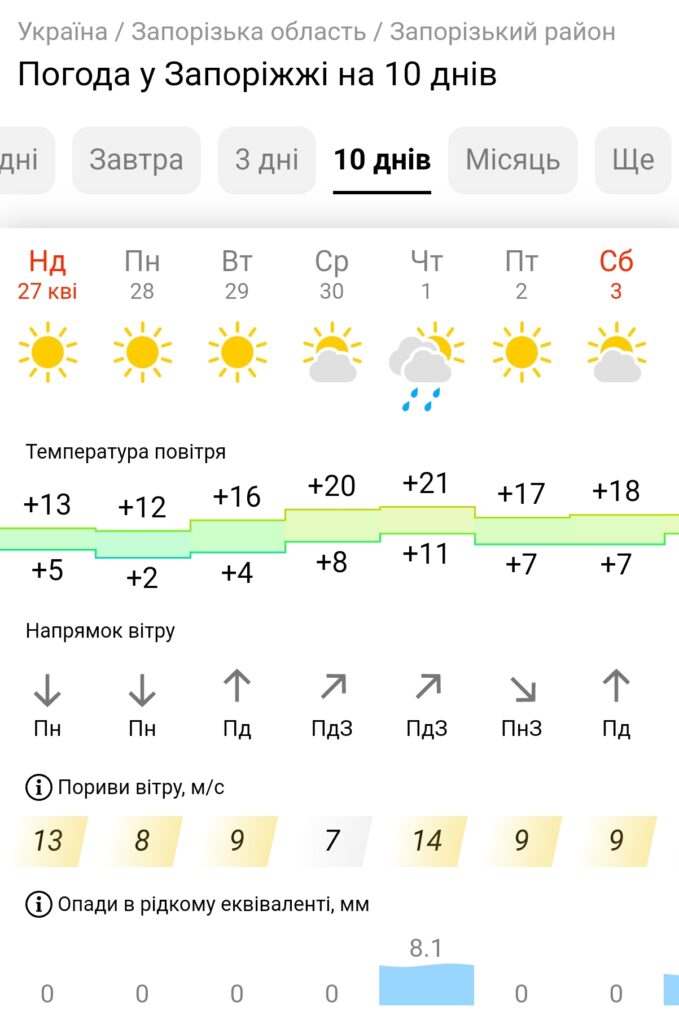 - 30 квітня – 3 травня: вночі від +7 до +11, вдень від +17 до +21 градуса. В четвер, 2 травня очікується дощ.