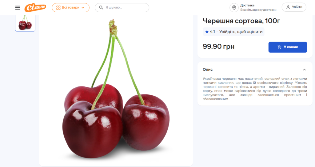 У магазинах «Сільпо» за 100 грамів сортової черешні просять 99,90 грн — це означає, що за кілограм доведеться віддати 999 грн.