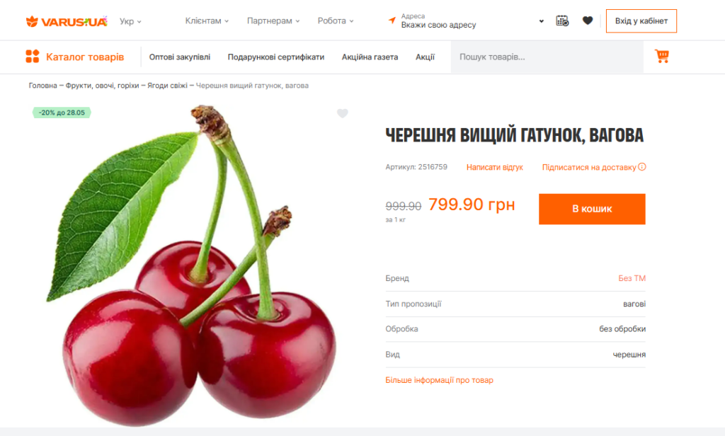У мережі «Varus» ситуація дещо краща: за кілограм черешні вищого ґатунку просять 799,90 грн (зі знижкою до 28 травня, звичайна ціна — 999 грн/кг).