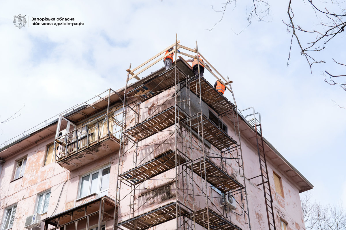 У Запоріжжі на вулиці Незалежної України триває відбудова житлового будинку, який зазнав пошкоджень після ворожого удару. Тоді вибух стався у куті споруди, через що змістилися конструкції.