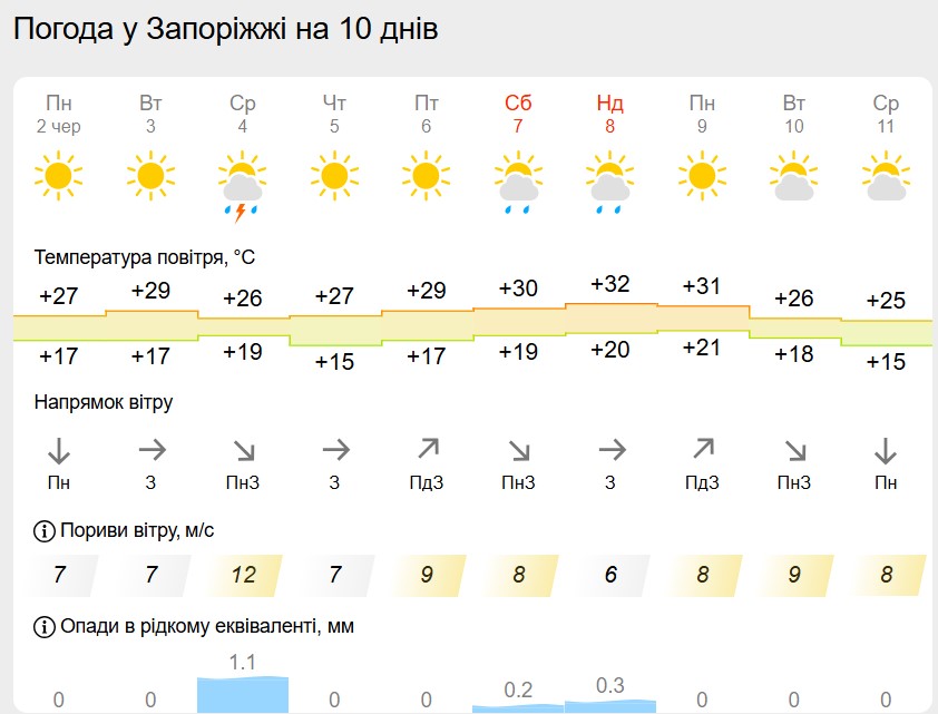 У Запоріжжі на початку тижня очікується до +29 градусів Цельсія. Також можливий доз з грозою у середу 4 червня. В цей день очікується невеличке зниження температури повітря до +26 градусів. Але вже з четверга температура знову піде в горе й досягне максимальної позначки +35 градусів у суботу та неділю. Погода буде хмарною, але без опадів.