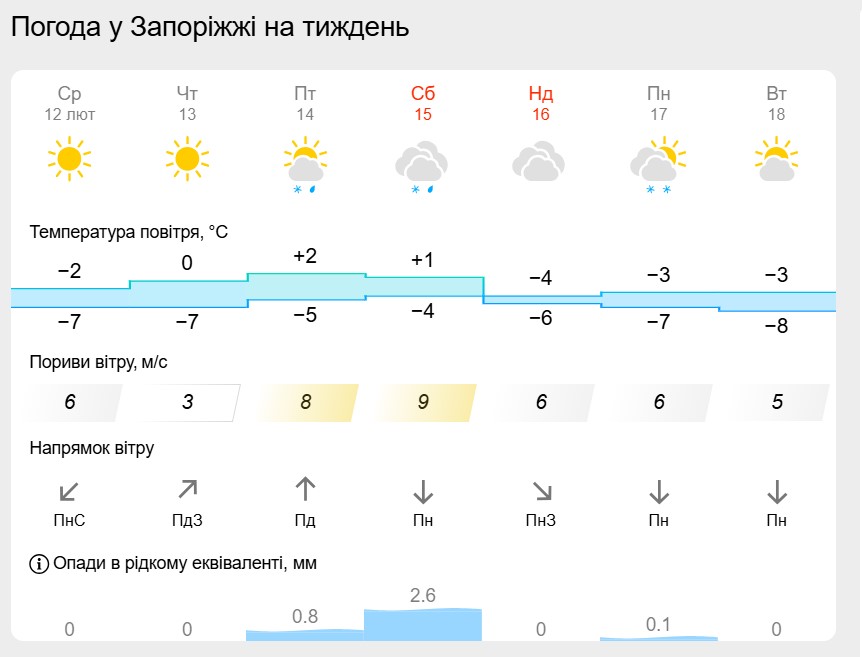 Завтра, 13 лютого, ранкові хмари протримаються недовго — вдень та ввечері у Запоріжжі очікується ясна погода. Опадів не прогнозується. У п’ятницю, на День всіх закоханих очікується хмарна погода, але з плюсовою температурую. Так, вдень очікується потепління до +3 градусів Цельсія.