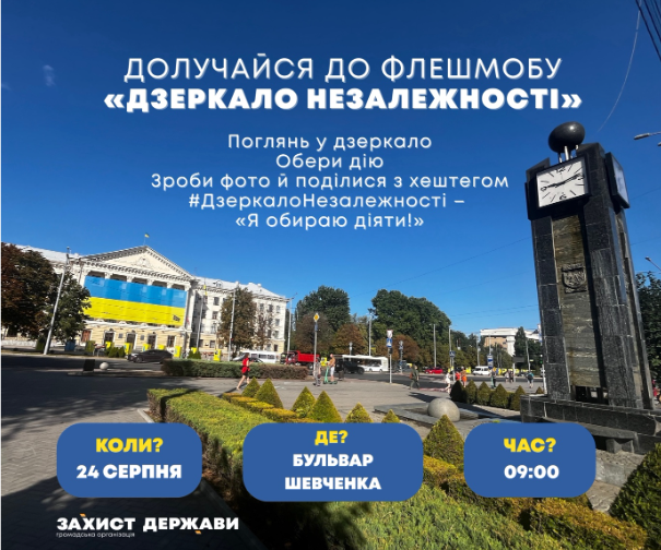 Учасники флешмобу матимуть змогу «подивитися у Дзеркало Незалежності», зробити фото та поставити собі важливе запитання: «Що я можу зробити для Перемоги вже сьогодні?».