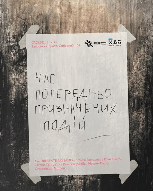 — Виставка «Час попередньо призначених подій» — презентація 7 березня о 17.30. Буде проводитися фото- та відеофіксація. Експозиція працюватиме у ТІЦ до 6 квітня.