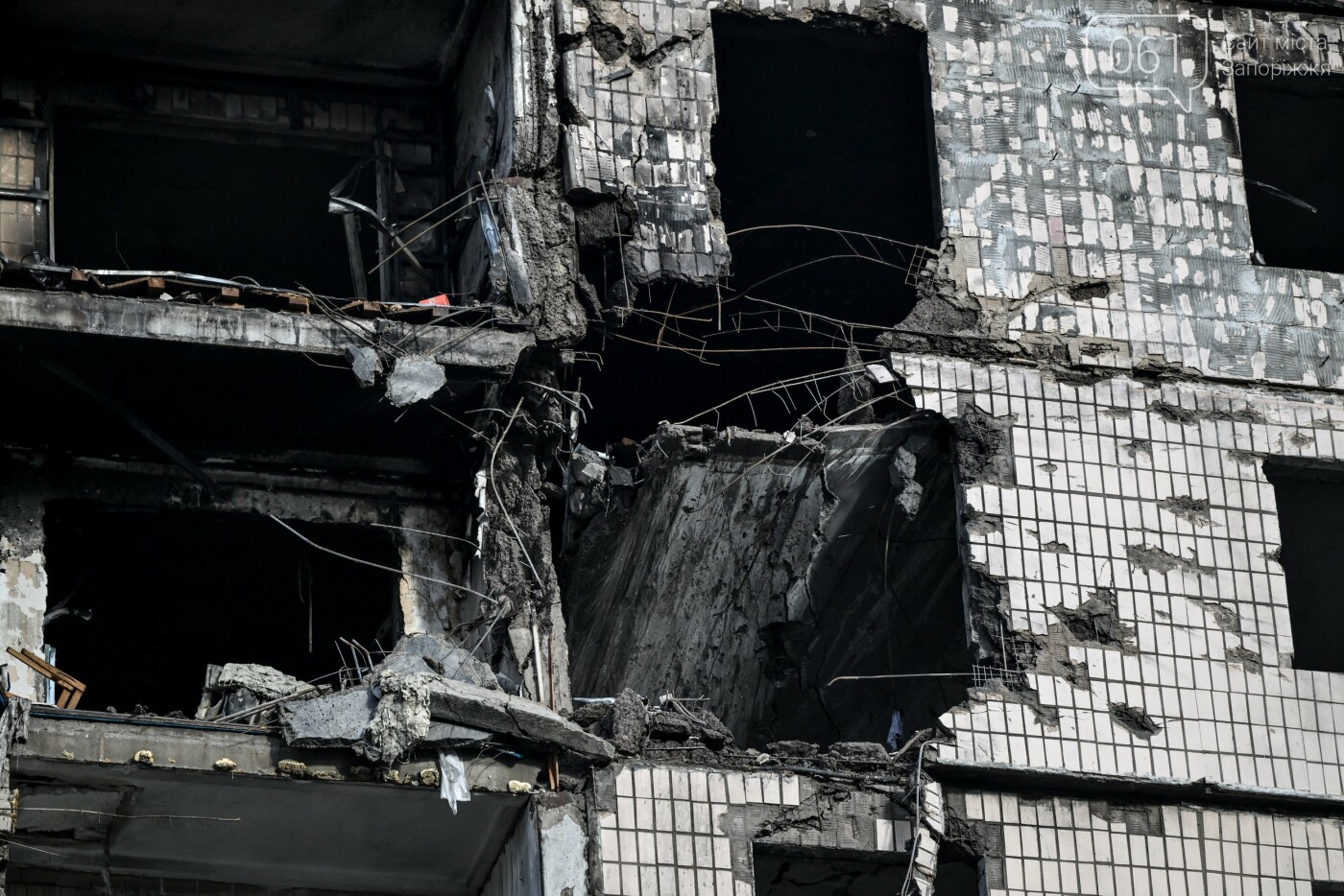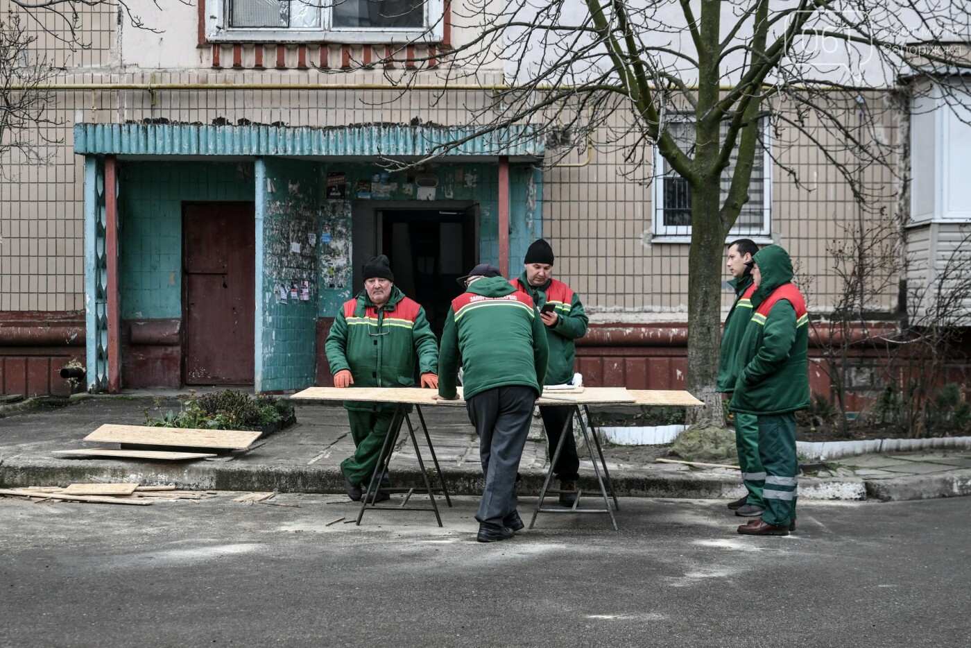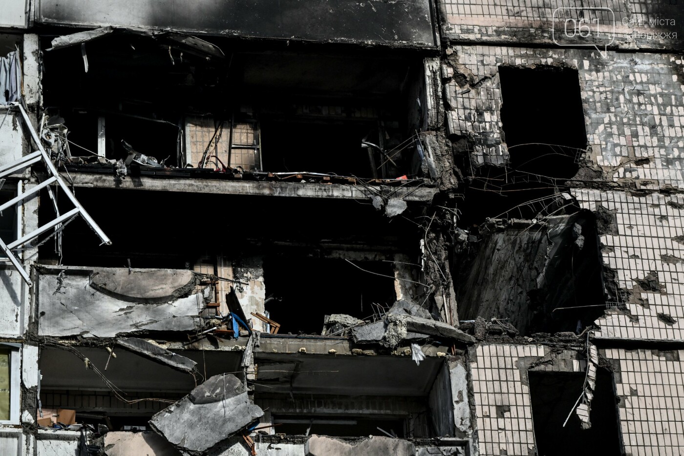 З самого ранку тут кипить робота. Комунальники забивають ОСБ-плитами вибиті вікна, прибирають аварійні конструкції та скло, аварійно-рятувальна служба працює на верхніх поверхах, власне там, де був епіцентр прильоту.