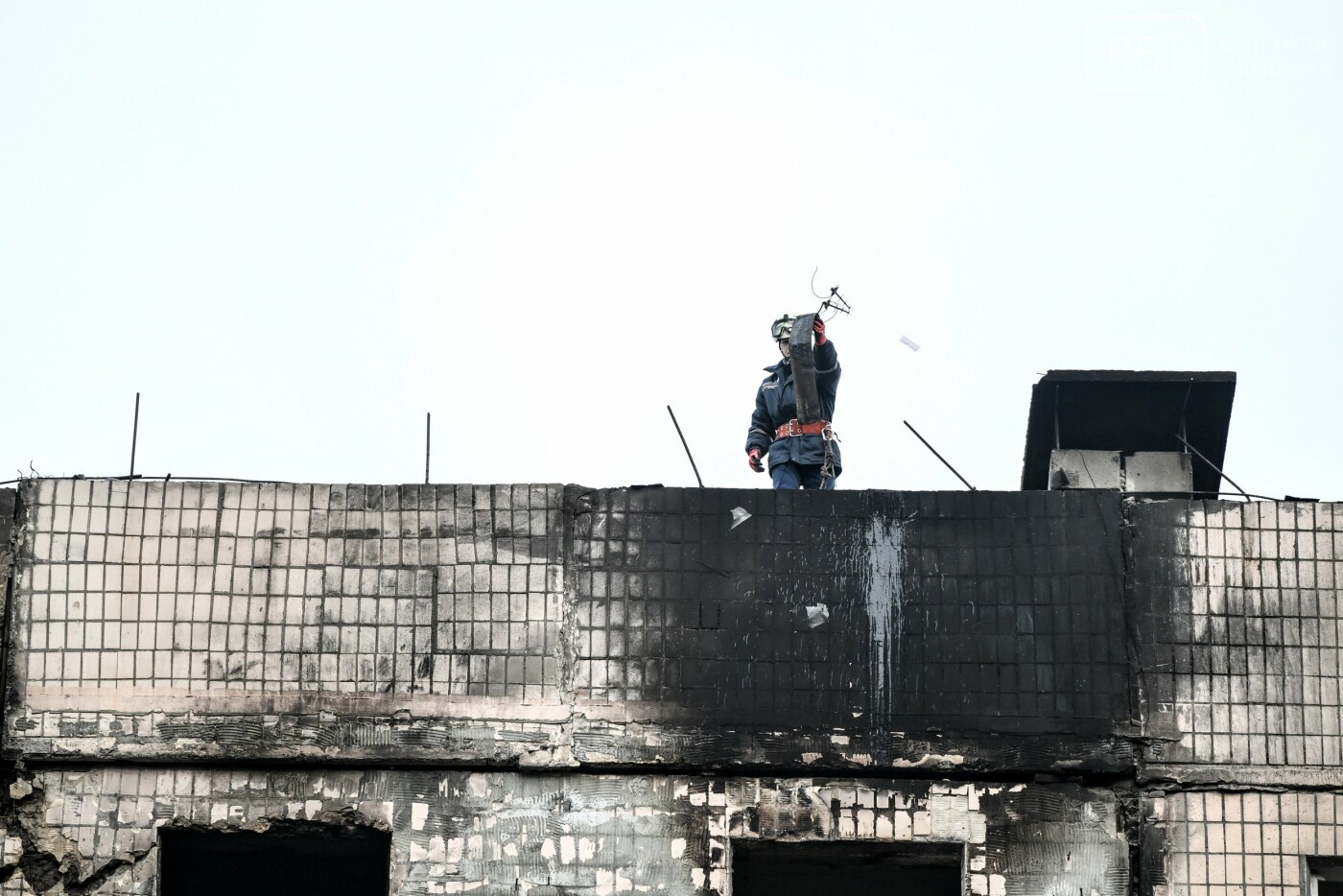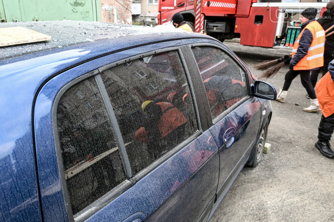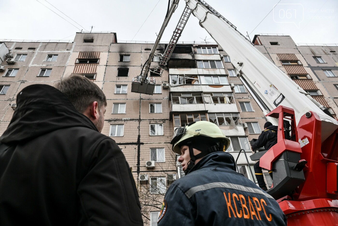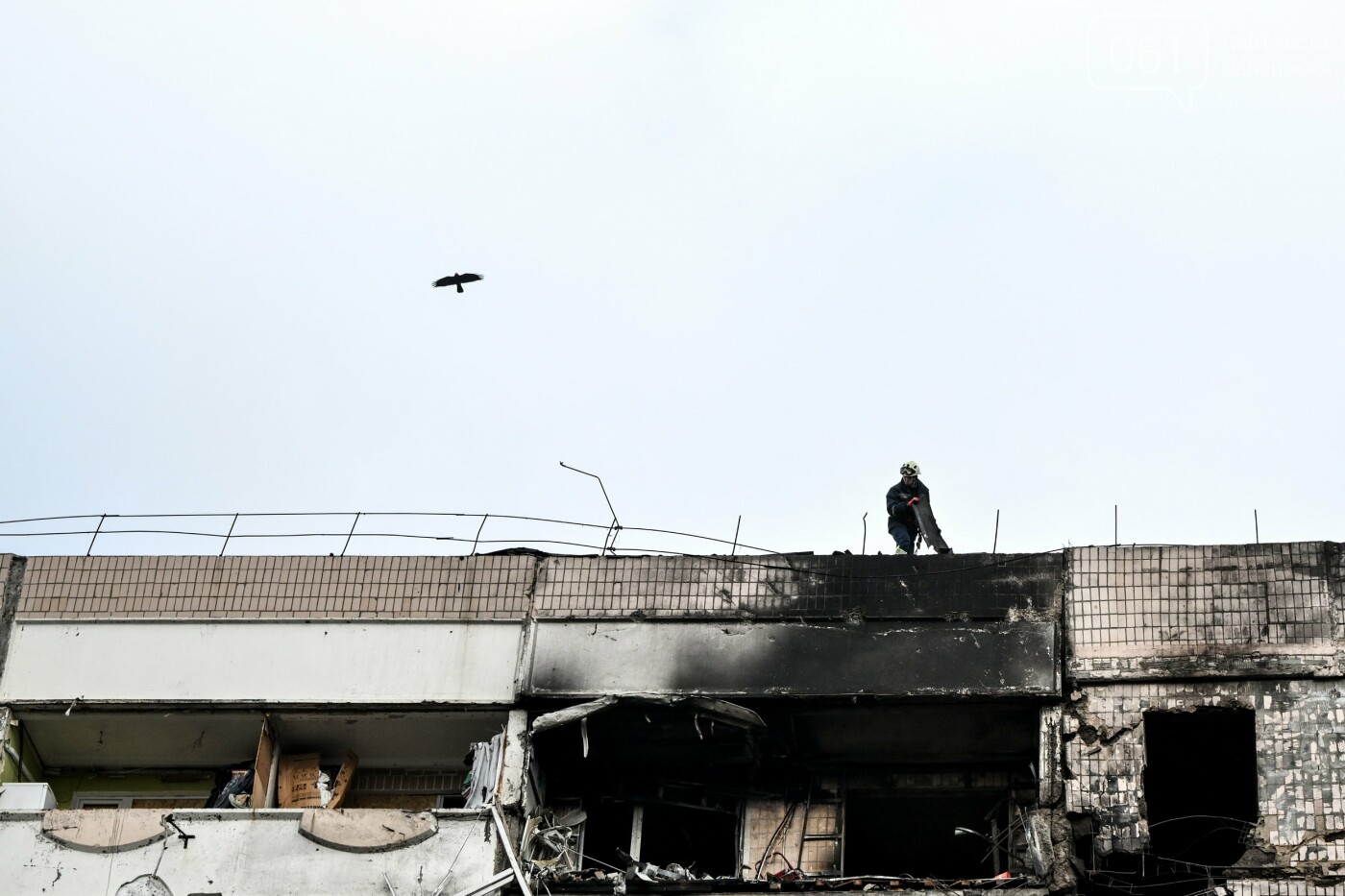 З самого ранку тут кипить робота. Комунальники забивають ОСБ-плитами вибиті вікна, прибирають аварійні конструкції та скло, аварійно-рятувальна служба працює на верхніх поверхах, власне там, де був епіцентр прильоту.