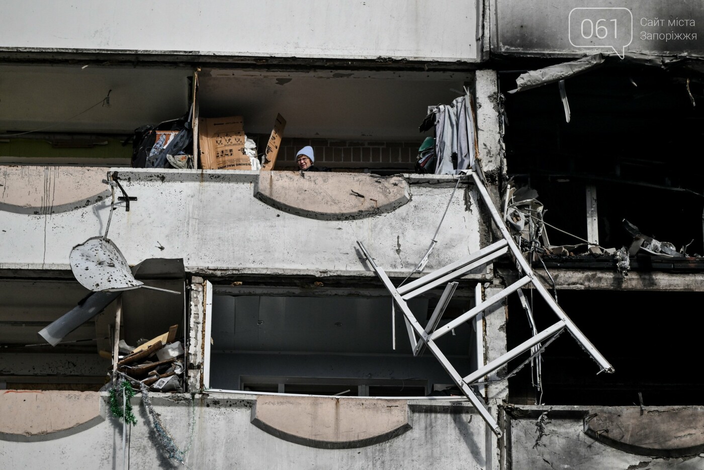 З іншої сторони будинку стоїть 68-річна Валентина Володимирівна. Жінка знімає на телефон потрощений балкон та вікна своєї квартири, яка в першому під’їзді на шостому поверсі. Квартири, що над нею, вщент вигоріли. Жінка ночувала у сина, він живе також в цьому районі. В момент атаки вона була на роботі, прибігла — щойно почула вибух і зрозуміла, що прилетіло десь зовсім близько.