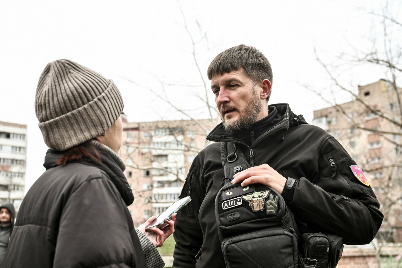 Його підводять до правоохоронців. В квартиру на той момент було заходити небезпечно. Тому чоловік просто віддає ключі і чекає біля під’їзду.