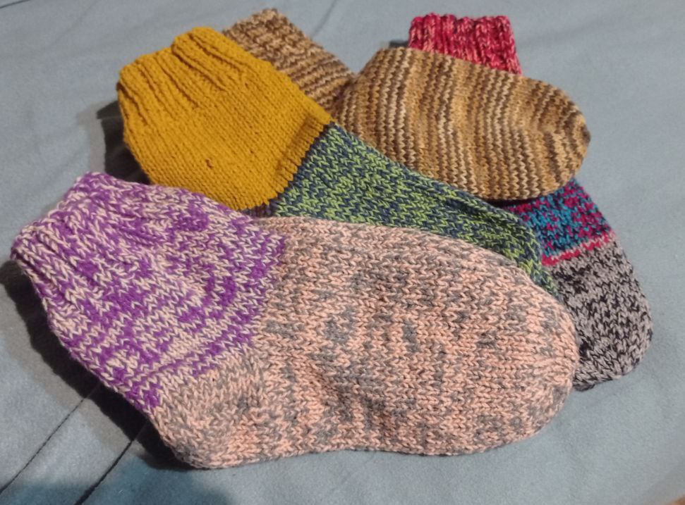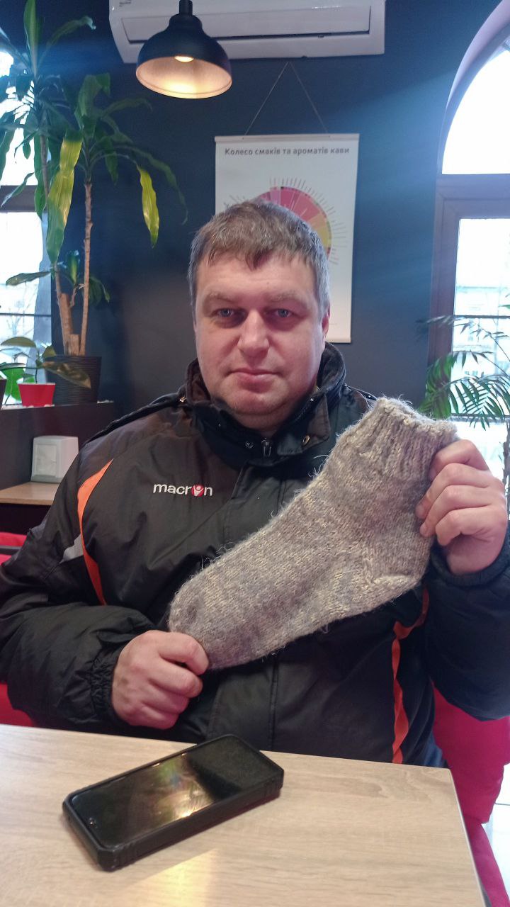 Шкарпетки Люда зв’язала для родини, евакуйованої з Донеччини, з Лиману. Для сина з інвалідністю, який отримав поранення, та для його літнього батька. Свою пару шкарпеток отримав й наш фотокор.
