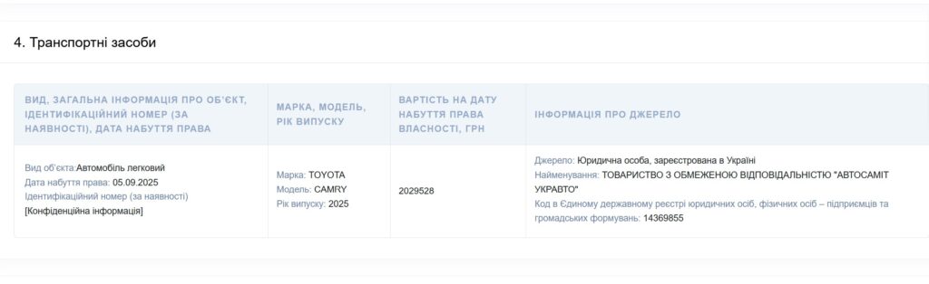 Керівник Запорізької обласної військової адміністрації Іван Федоров повідомив про зміни у декларації майнового стану. Згідно з даними Єдиного державного реєстру декларацій, Федоров придбав автомобіль Toyota Camry 2025 року за 2,029 млн грн. У документі операція вказана як «купівля-продаж (міна)».