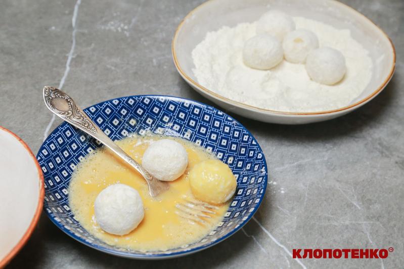 Збийте 2 яйця для панірування. Окремо у миски викладіть 50 г борошна та 150 г панірувальних сухарів. Запаніруйте картопляні кульки у борошні, яйця та сухарях. Потім знову у яйці та сухарях.