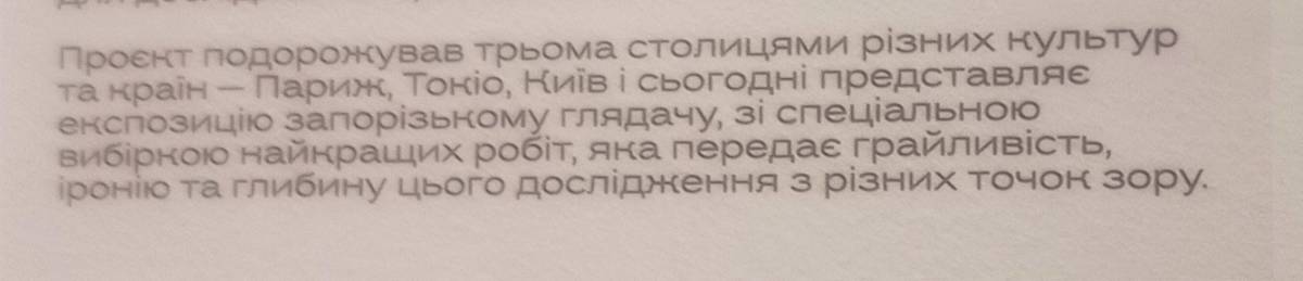 Цей вираз отримав підтвердження на виставці, яка триває в Мистецькому  центрі Запоріжжя, яка крім узагальненої назви фестивалю сучасного колажу CUTOUT COLLAGE FESTIVAL має лід – «Код ідентичності. Нація. Культура. Політика».