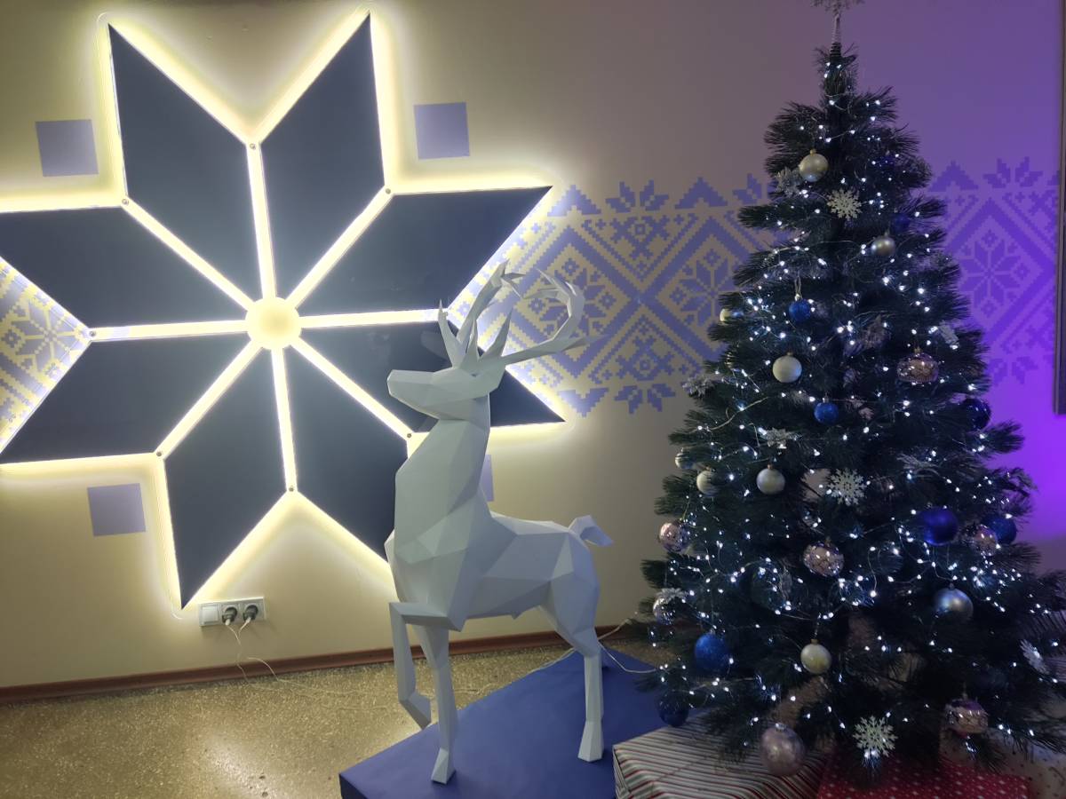 Поруч із святковою ялинкою в фойє стоїть білосніжний олень.