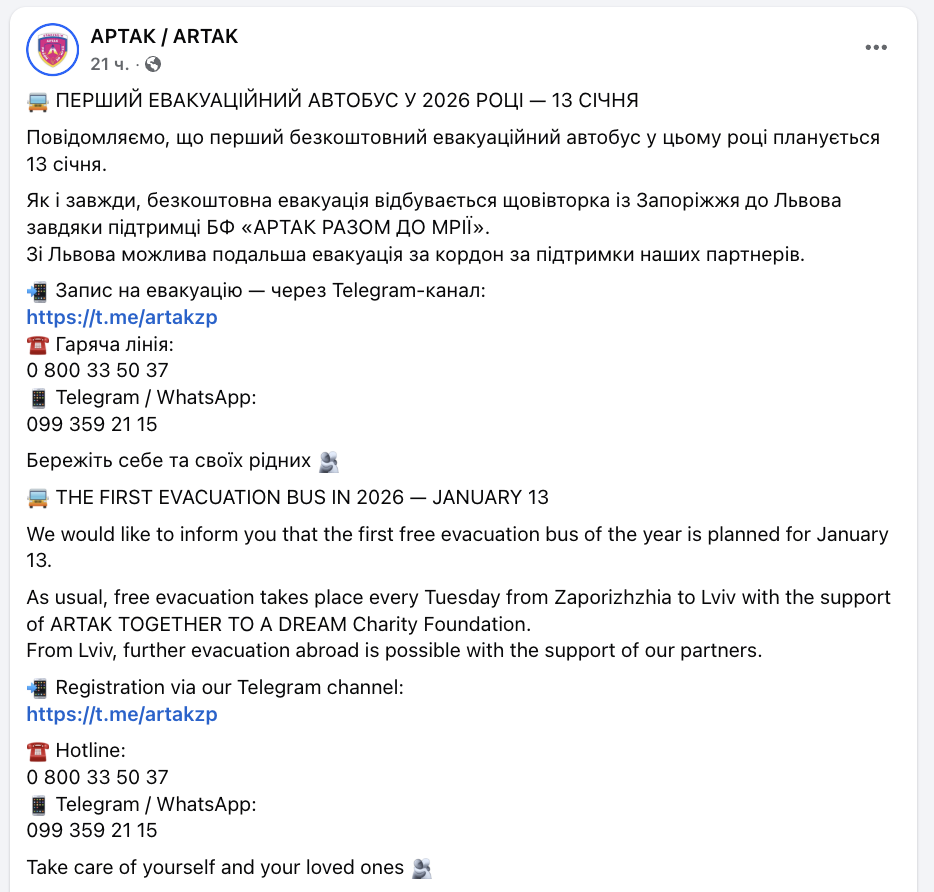 Перший у 2026 році безкоштовний евакуаційний автобус із Запоріжжя вирушить 13 січня. Про це повідомили організатори програми евакуації.