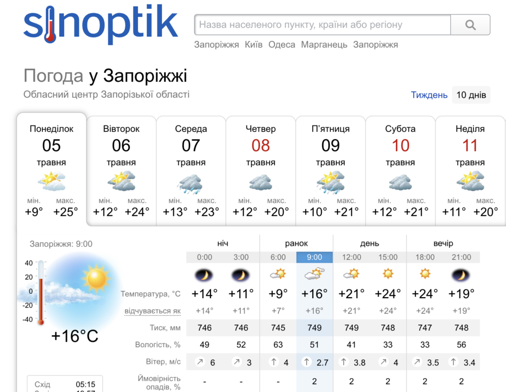 На початку травня погода в Запоріжжі залишається теплою, однак вже з середини тижня метеорологи прогнозують зміну атмосферних умов. За даними сервісу Sinoptik.ua, опади ймовірні починаючи з середи, а найбільш дощовими днями стануть п’ятниця та вихідні.