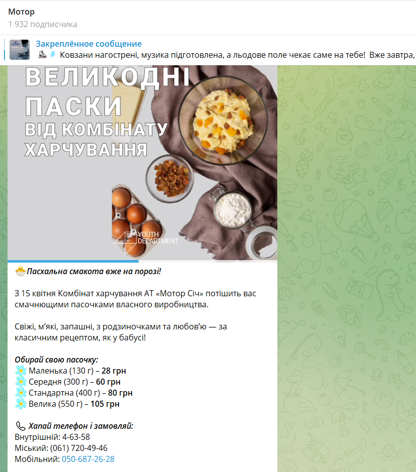 Із 15 квітня Комбінат харчування акціонерного товариства «Мотор Січ» розпочинає продаж великодніх пасок власного виробництва.