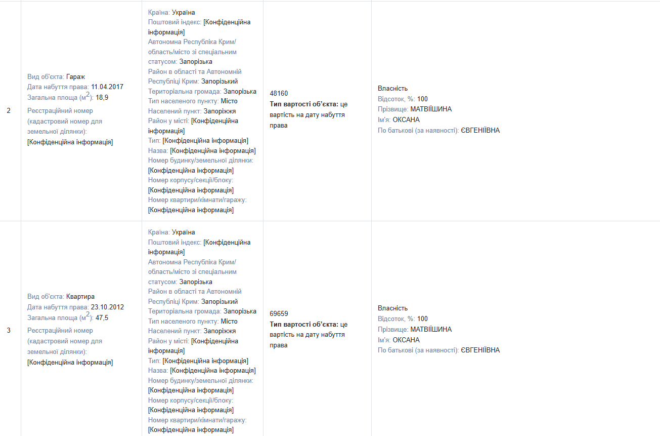 У обох деклараціях фігурує гараж площею 18,9 квадратних метри, що також належить Матвіїшиній.