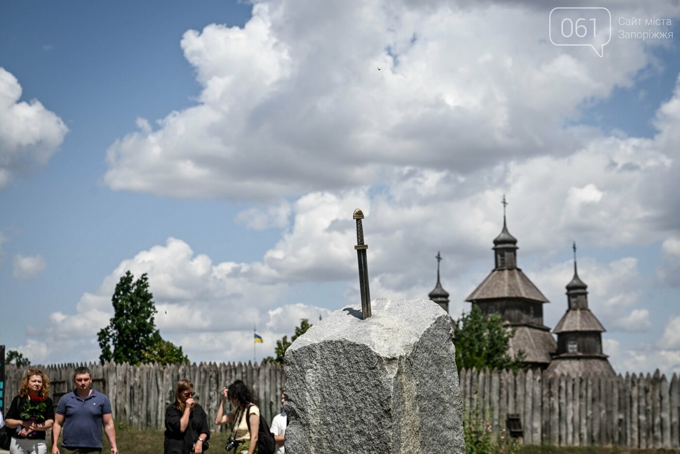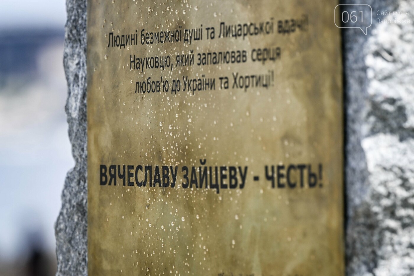«Людині безмежної душі та Лицарської вдачі. Науковцю, який запалював серця любовʼю до України та Хортиці. Вячеславу Зайцеву — честь!». Табличка з таким написом, а також уривком вірша Василя Симоненко «Де зараз ви, кати мого народу?» прикрашає камʼяну брилу, в середині якої меч. Такий самий, який було знайдено на острові в 2011 році і який повʼязують з князем Святославом Хоробрим.