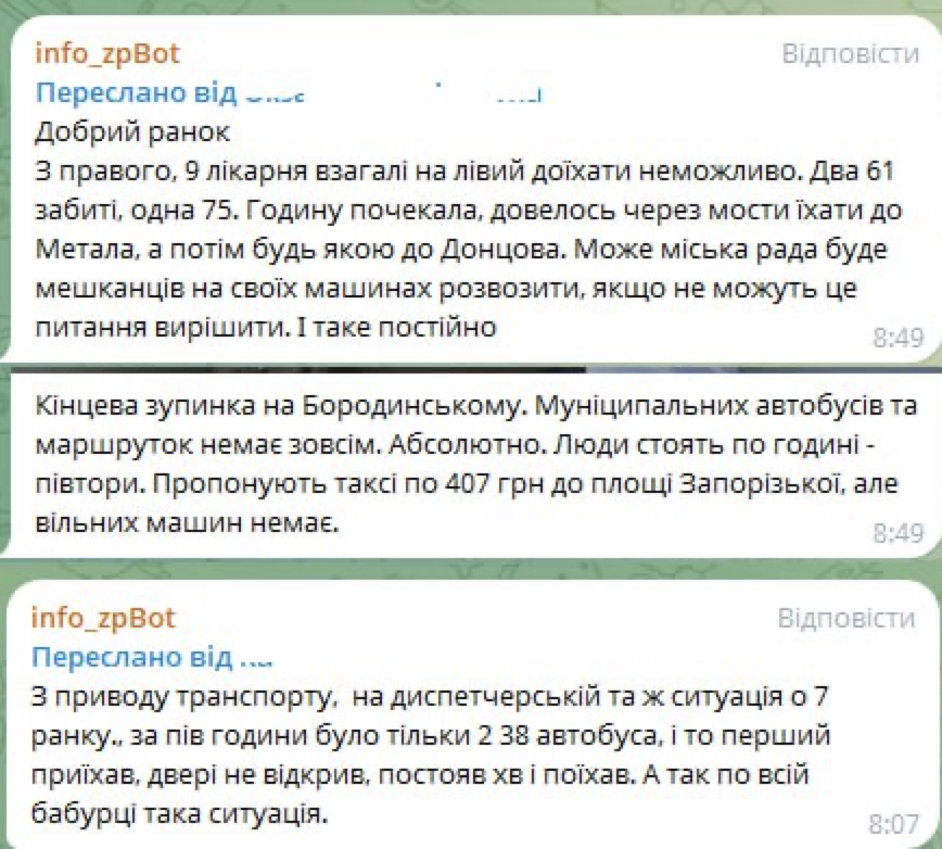 За словами запоріжців, зранку практично неможливо доїхати з окремих районів міста. Зокрема, мешканці повідомляють, що з Правого берега дістатися на Лівий бік майже нереально: частина маршрутів не працює, інші — переповнені або просто не приїжджають.