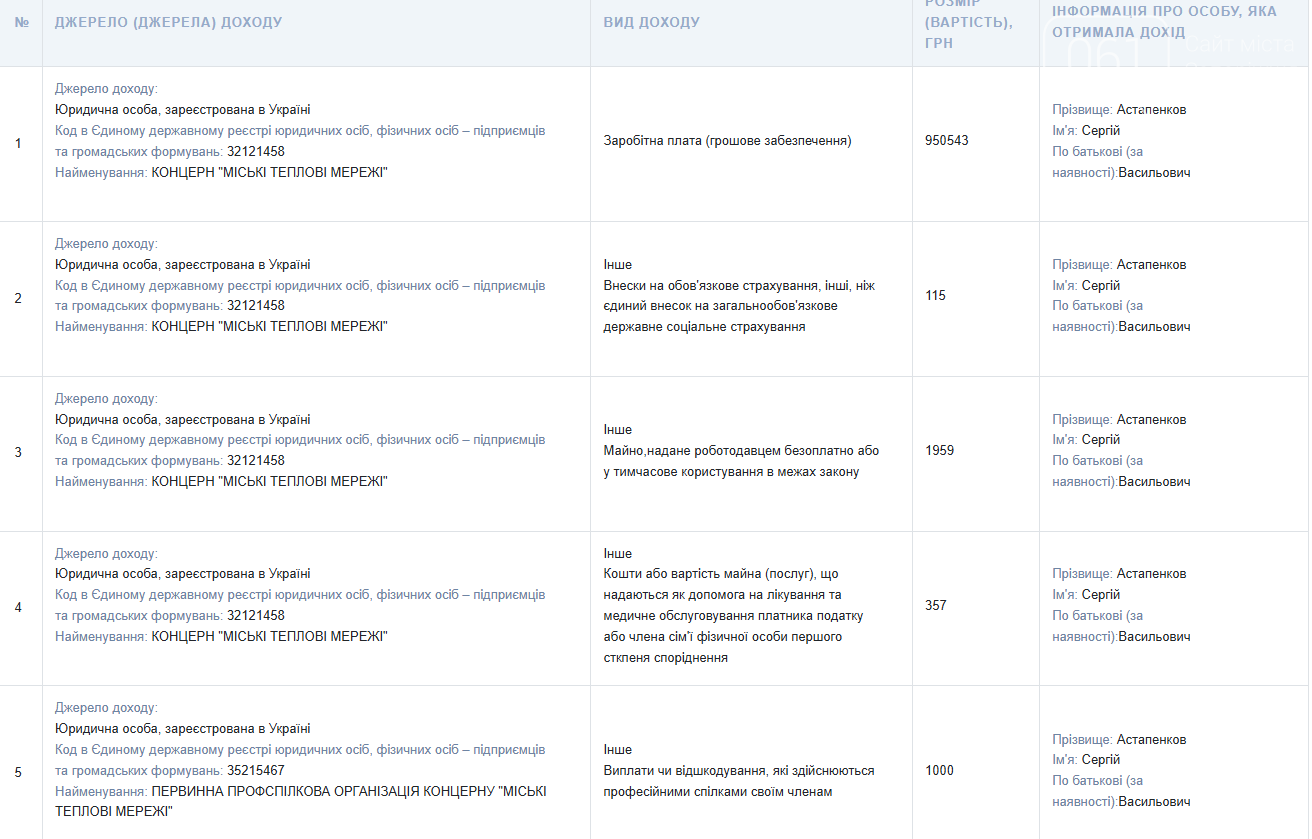 У щорічній декларації за 2016 рік Сергій Астапенков, тоді працював на посаді головного інженеру «Міських теплових мереж».
