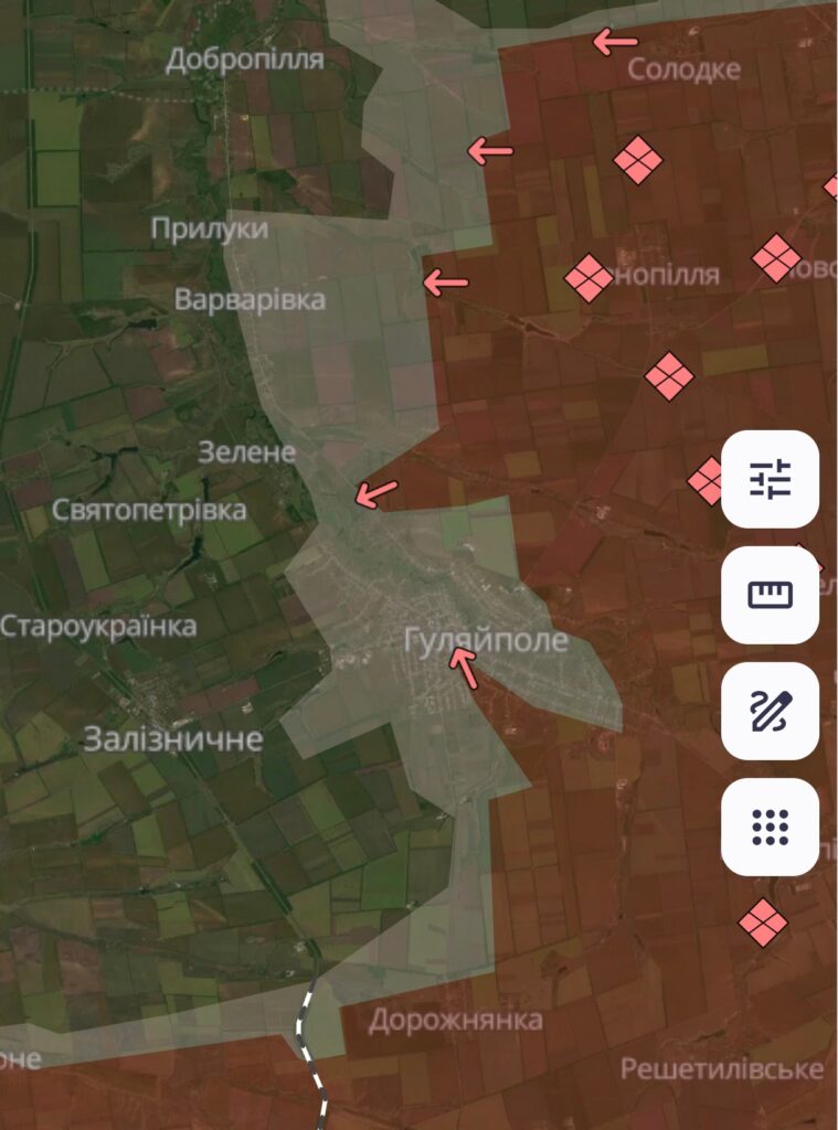 За останніми оновленнями DeepState більша частина Гуляйполя перебуває у сірій зоні – в місті присутні як українські бійці, так і ворог. Ситуація залишається складною.