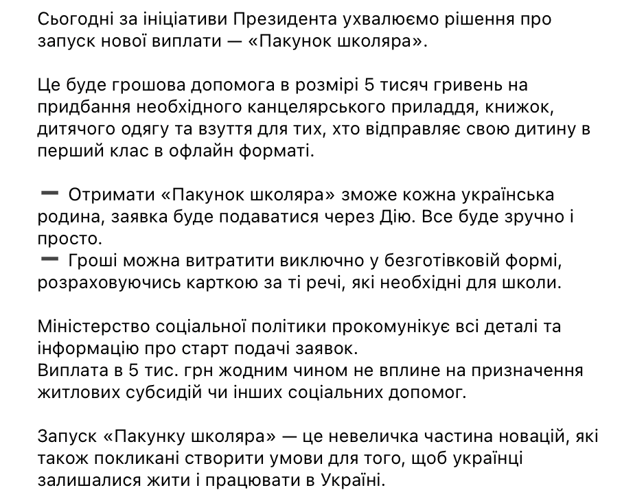 Ці кошти призначені для забезпечення дітей усім необхідним до початку навчального року — зокрема шкільним одягом, взуттям, підручниками та канцтоварами. Отримати допомогу зможуть усі українські родини, чиї діти йдуть у перший клас та навчатимуться в офлайн-форматі.