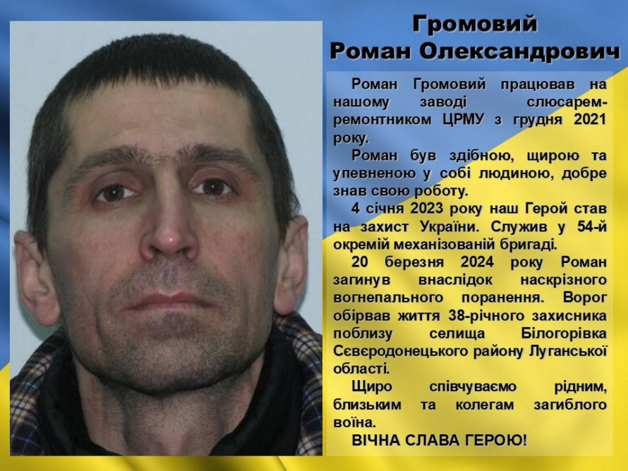 Роман Громовий працював на заводі з грудня 2021 року. Був слюсарем-ремонтником цеху з ремонту металургійного устаткування.