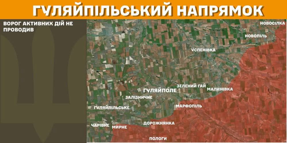 За даними Генштабу ЗСУ, активних штурмових дій на Гуляйпільському напрямку росіяни не проводили. Проте кілька днів тому окупанти активно атакували на схід від Гуляйполя. Ситуація залишається складною у зв’язку з активними штурмовими діями ворога в районі Великої Новосілки та Курахового.