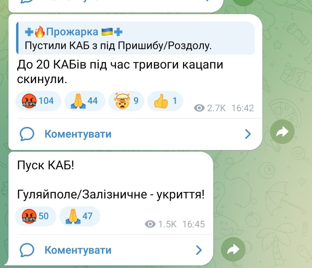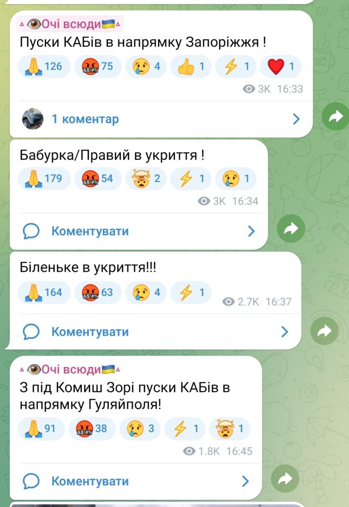 за інформацією моніторингових каналів після 16-ї години вже випущено близько 20 КАБів, зокрема а напрямку району Оріхова та Гуляйполя.