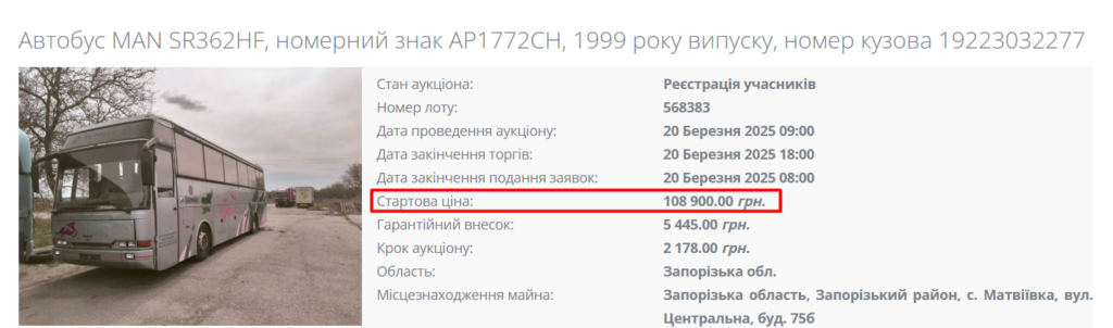 Для реалізації з торгів виставлений автобус MAN SR362HF 1999 року випуску.