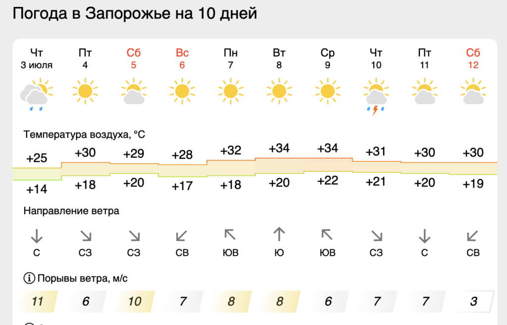 Лише 10 липня очікується короткочасне послаблення – можливі грози та зниження температури до +31°C. Однак загальна тенденція залишиться спекотною і до наступних вихідних.