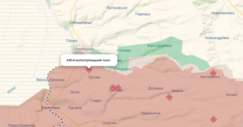 За даними аналітичного ресурсу DeepState, 429-1 мотострілецький полк займає позиції поблизу н.п. Лугове, що трохи південніше Кам’янського та північно-східніше Василівки. Як відомо, нещодавно ЗСУ мали просування в районі Кам’янського. За даними європейских осінтерів на напрямку діє підрозділ ГУР МО “Кракен”.