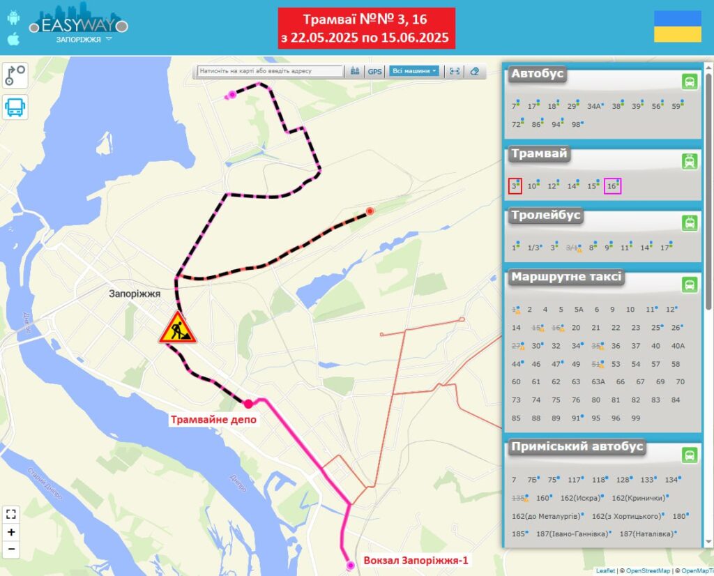 - з 9:00 22 травня по 15 червня 2025 р. трамваї №3 та №16 будуть працювати за маршрутом “Вокзал Запоріжжя-1 – Трамвайне депо”.