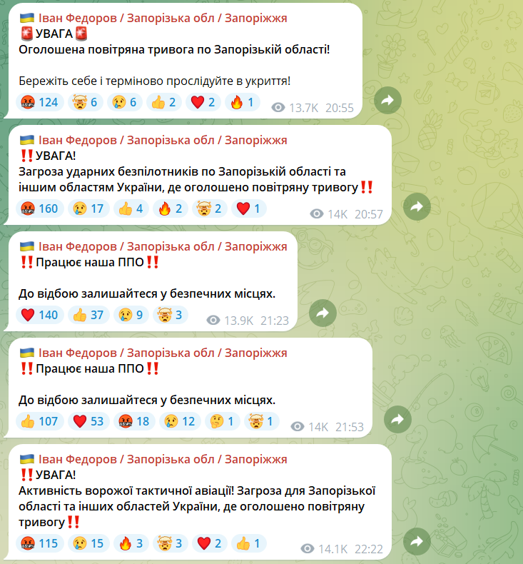 Як повідомив очільник ЗОВА Іван Федоров, вона була пов’язана з загрозою ударних безпілотників по Запорізькій області.