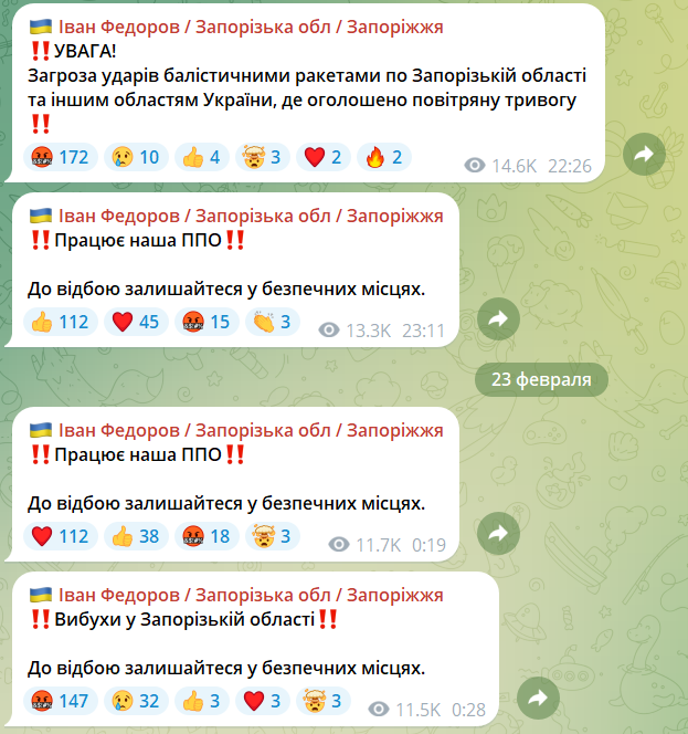 О 22-26 до атаки БПЛА додалась загроза ударів балістичними ракетами по Запорізькій області.