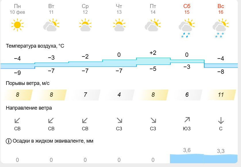 На День закоханих, 14 лютого, очікується хмарна погода, але вдень температура має піднятися до позначки +2 градуси Цельсія. 15 лютого протягом усього дня у Запоріжжі буде триматися хмарна погода. На зміну нічному дрібному дощу, прийде сніг, який удень почне стихати, а ближе до вечора закінчиться. Опади також можливі 16 лютого, коли мороз знову повернуться.