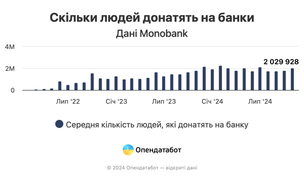 Побільшало й донатів: 8,8 млн транзакцій на місяць проти 1 млн транзакцій на місяць у 2023.