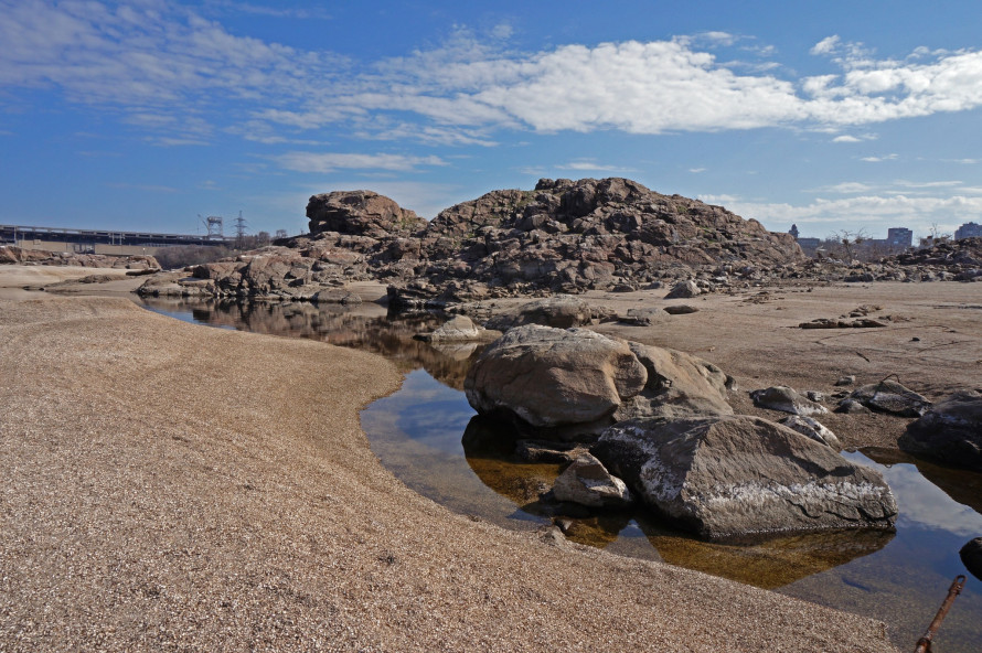 Через значне зниження рівня води у Дніпрі біля Запоріжжя відкрилися прадавні пороги між греблею та Хортицею, а заповідні острови навколо – Дубовий, Розтьобін, скелі Два брати та Три Стоги – перестали бути ізольованими водою. Тепер до них можна дійти пішки, чим активно користуються місцеві жителі попри наявні заборони.