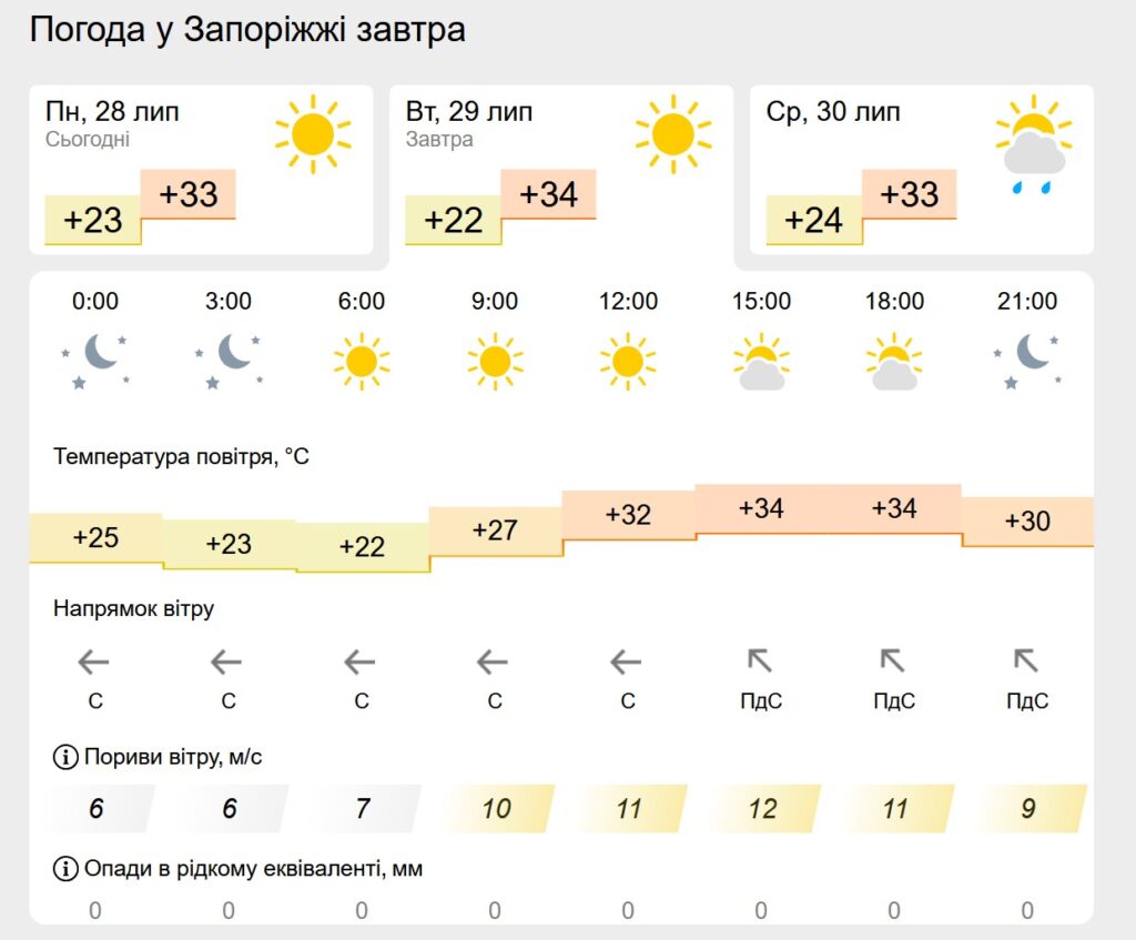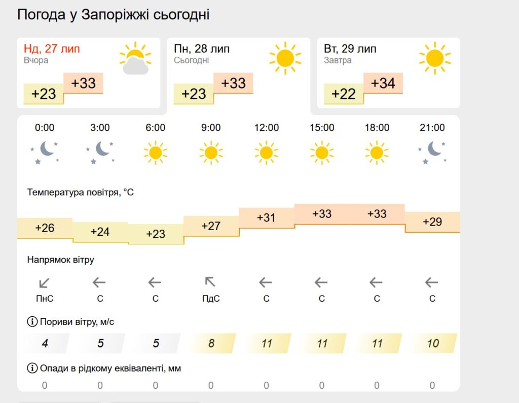 День 28 липня обіцяє буде сонячним і безхмарним. З 09:00 тепература повітря вже прогріється до +27°С і поступово зростатиме до +33°С ближче до другої половини дня. Ввечорі спека триматиметься і тільки вночі впаде до +29°С. Будьте обережні: вдень також очікуються сильні пориви вітру – до 11 м/с. У той же час 28 липня опадів не буде, тому чекаємо на сухий спекотний, але вітряний день.