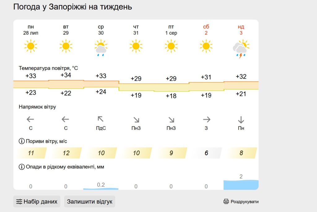 До кінця тижня температура поступово спадатиме. Вже днем у середу 30 липня йтиме невеликий дощ, але при цьому спека триматиметься на позначці +33°C до ночі.